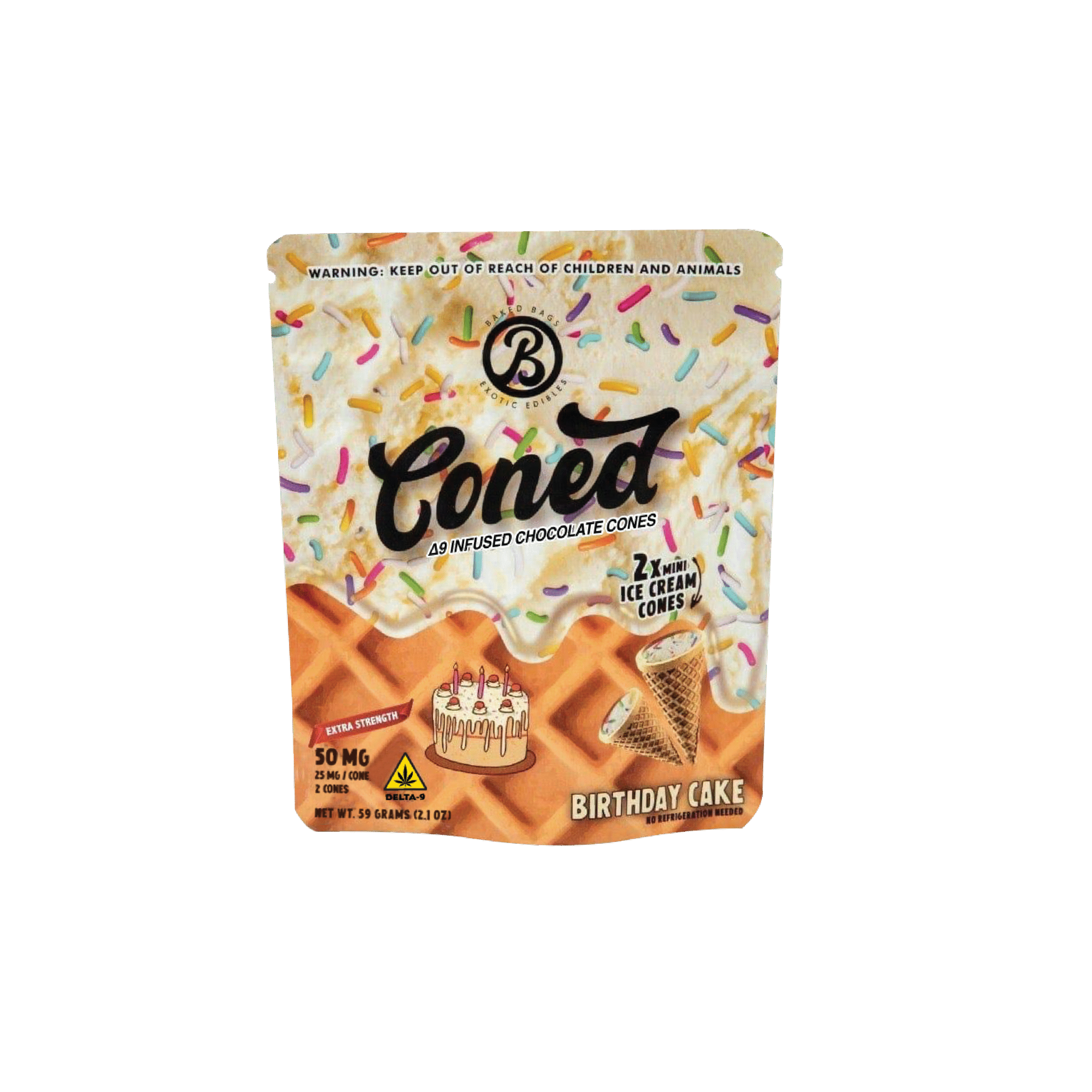 Treat yourself to the indulgent taste of birthday cake with these premium Delta-9 THC edibles from Baked Bags. Each cone-shaped treat delivers 25mg of Delta-9 THC per piece, with two pieces per package for a total of 50mg. The rich birthday cake flavor combines sweet vanilla cake notes with creamy frosting undertones, creating an authentic dessert experience. These lab-tested edibles offer consistent dosing and reliable effects.