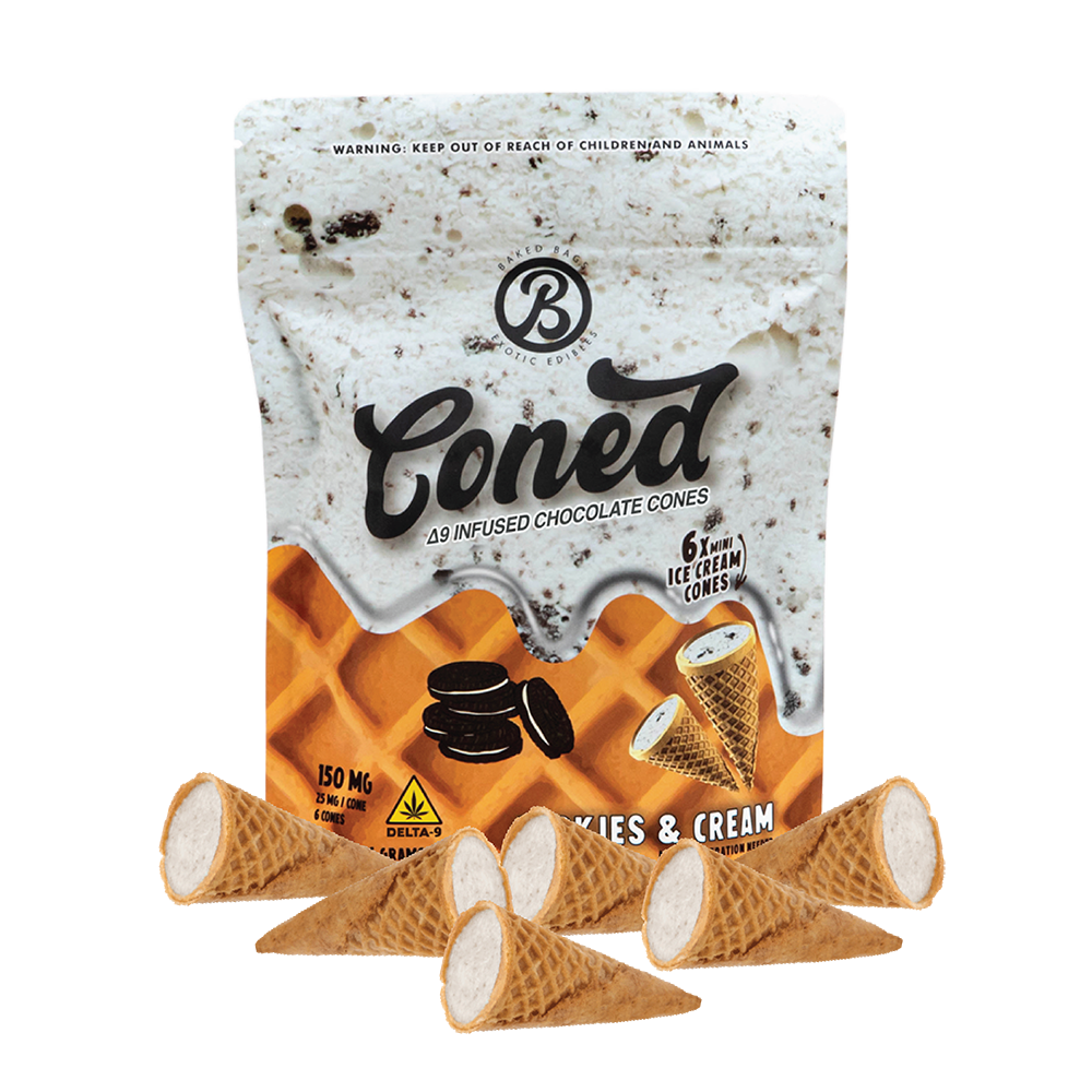 Baked Bags delivers premium ice cream cone-shaped edibles with authentic Cookies & Cream flavor and 150mg of high-quality Delta-9 THC. These unique cone-shaped treats combine nostalgic dessert appeal with precise dosing. Each package contains six individually wrapped cones, offering convenient portion control and extended freshness.