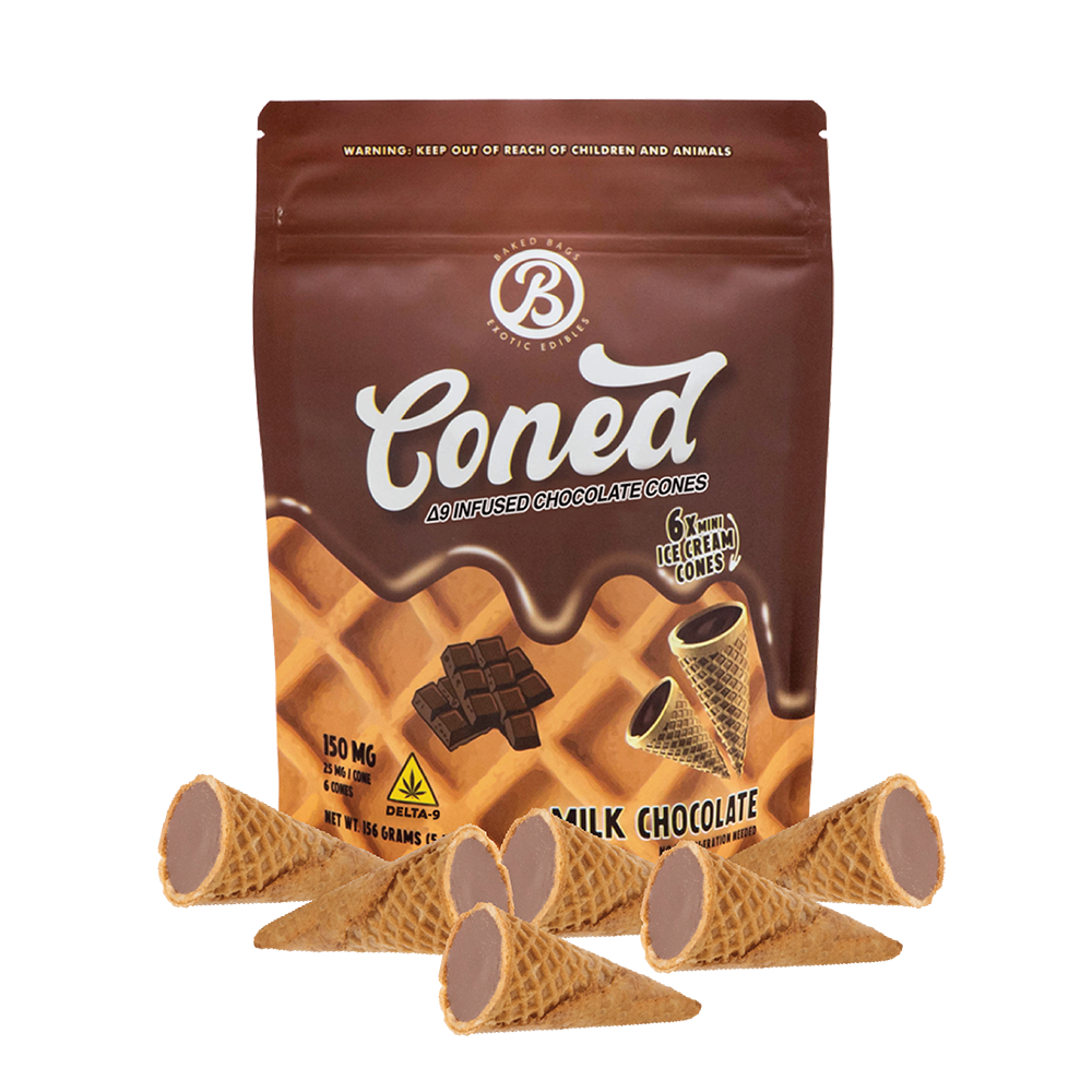 Premium cone-shaped edibles featuring rich milk chocolate flavor and potent Delta-9 THC formulation. Each cone delivers 25mg of psychoactive cannabinoids in a unique waffle cone format. Baked Bags combines nostalgic dessert flavors with precise dosing for consistent experiences.