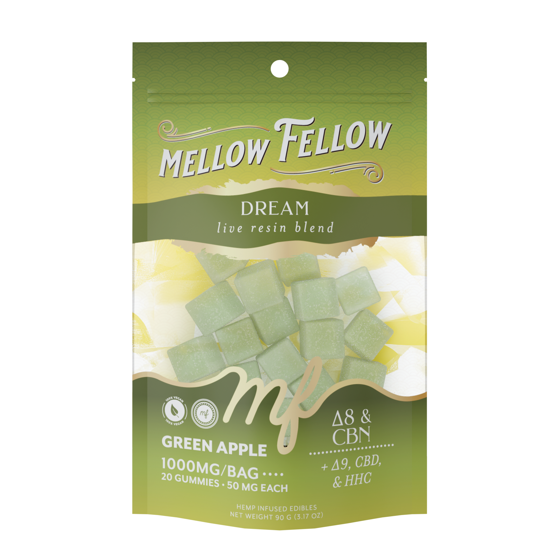 Dream Live Resin Gummies are a tart green apple twist on your sweetest dreams. This soothing Delta 9 THC blend is perfect for unwinding after a long day or setting the mood for a chill evening. With each gummy, you can expect to ease into a state of calm as your worries fade and your body melts into total comfort.