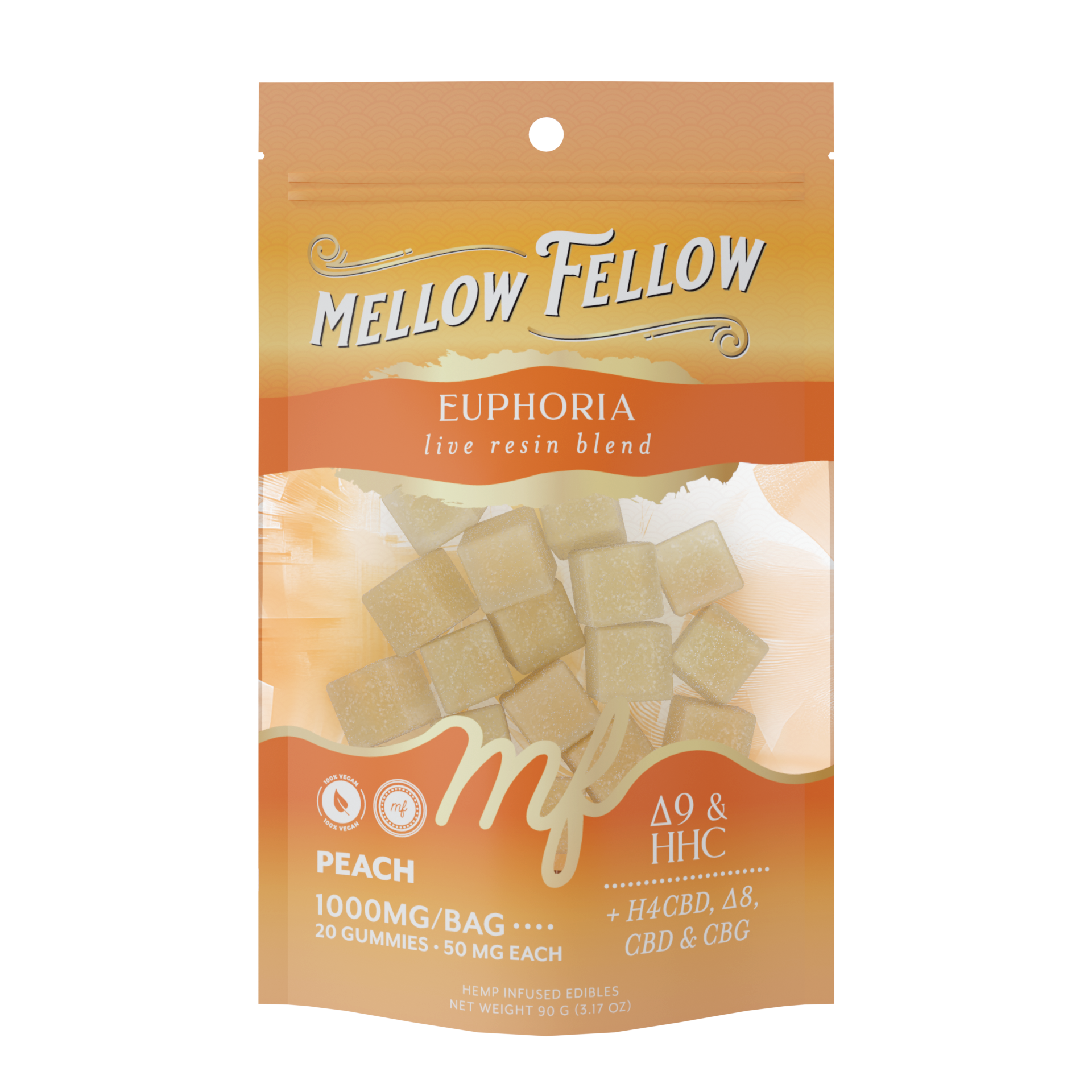 The Euphoria Blend in juicy peach flavor enhances bliss and uplifts your mood. With each bite, you’ll feel the waves of positivity wash over you as your mind and body align in perfect harmony. Whether you’re vibing with friends or diving into your next creative project, Euphoria Live Resin Gummies are your go-to for good times.