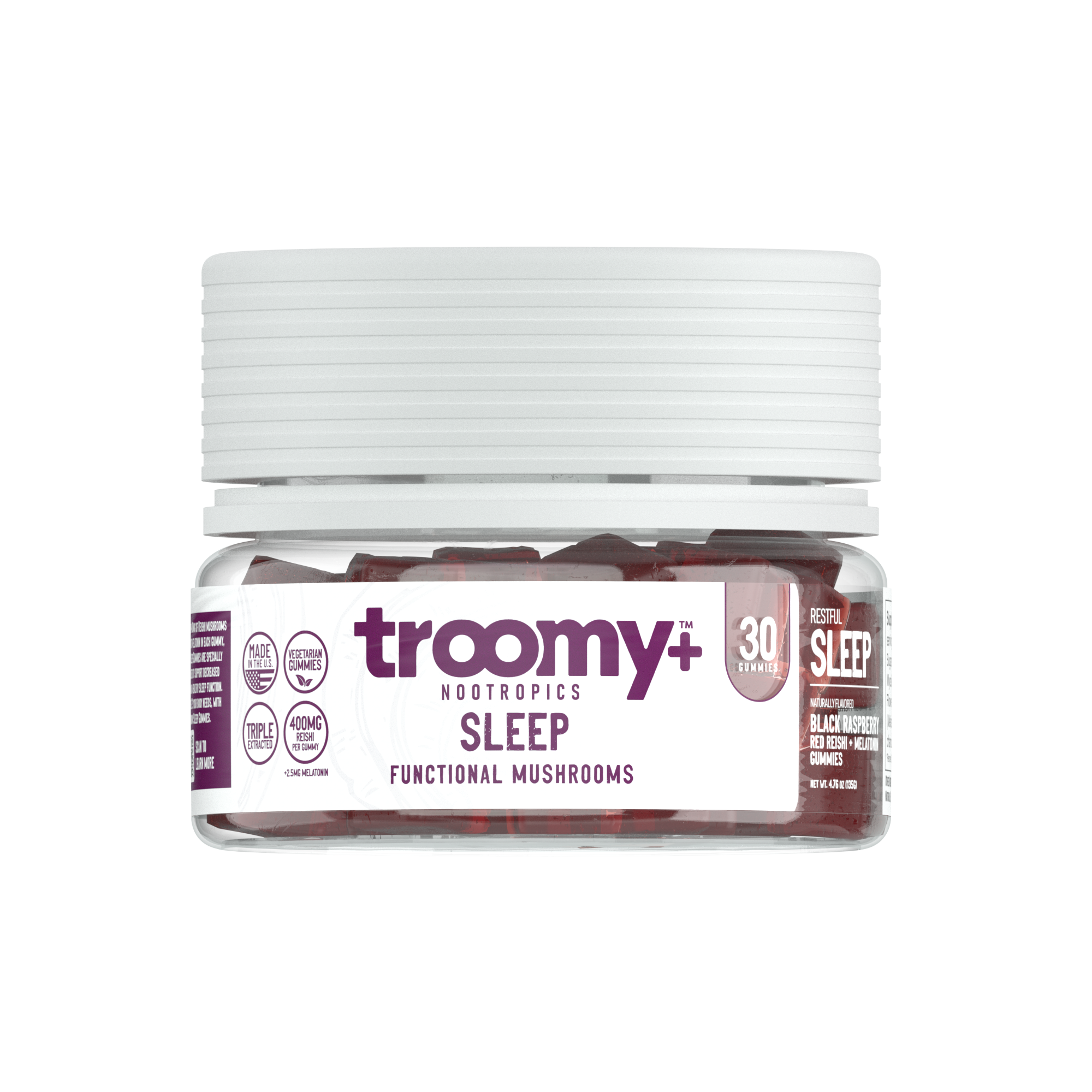 Support more restful habits with Sleep gummies from Troomy. Using reishi and melatonin supplements in every gummy, Sleep is a powerful natural solution to help the body and mind find a state of relaxation before bedtime. Black raspberry flavors power our organic Sleep gummies to regulate better sleep habits with zero caffeine, low sugars, and high vitamin/mineral content. Keep your body function well supported every night to ensure you get a good night’s sleep before work, school, or day at home.