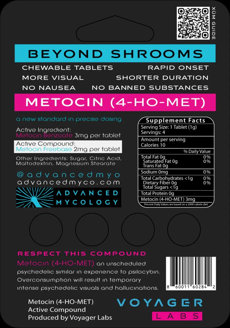 The active compound in XÜM tablets is Metocin (4-HO-MET). Metocin is an unscheduled psychedelic, similar in experience to psilocybin, but superior to psilocybin for several reasons: